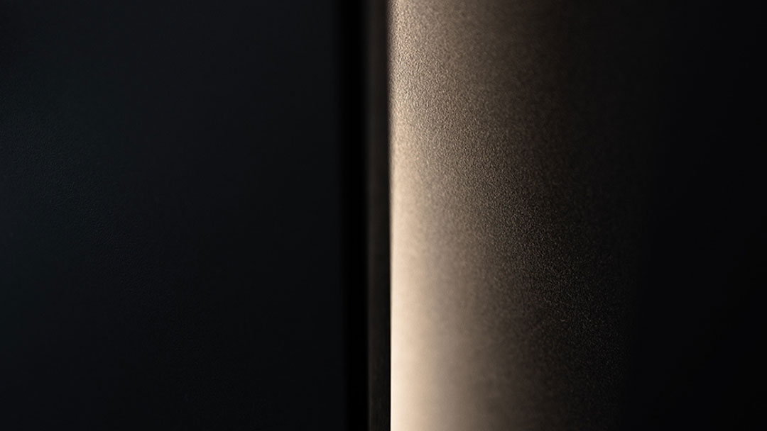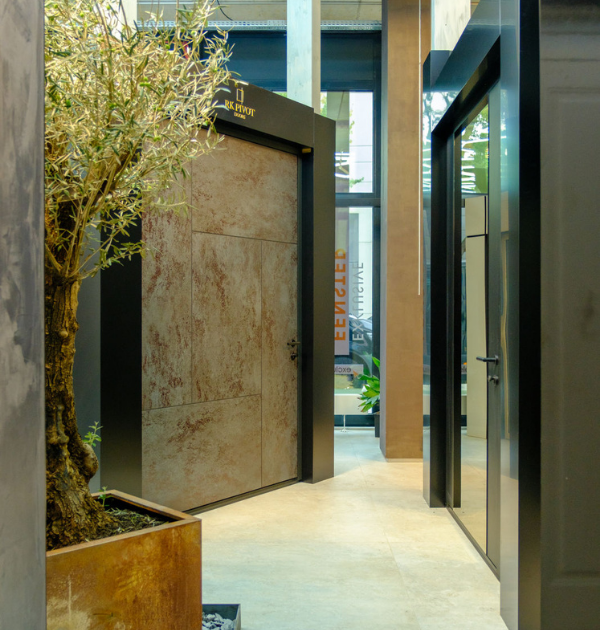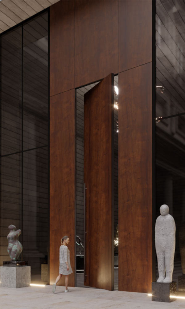 Höher, weiter, besser. Für dieses Projekt wurde die Gesamtkonstruktion aus dem Oberflächenmaterial der Tür, dem Türgriff und den seitlichen Fenstern über die gesamte Flügelhöhe von fast 6 Metern fortgeführt. Die mit Flüssigmetall veredelte Oberfläche zieht dabei durch ihren edlen Glanz alle Blicke auf sich. Diese raffinierte Oberflächenveredelung ermöglicht eine vollumfängliche Personalisierung, sodass Sie ganz individuelle und einzigartige, künstlerische Kompositionen erschaffen können.