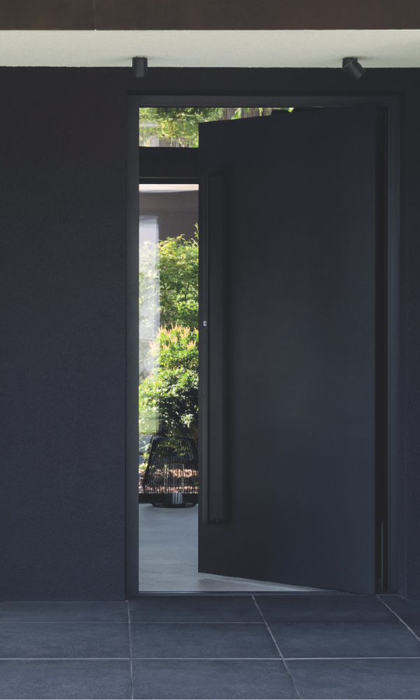 Tiefschwarz und minimalistisch. Eine Tür, die schlichte Form und zeitlose Eleganz vereint. Der Bauherr wollte eine einfache Tür, die sich in seine Vision einfügt und gleichzeitig eine hohe Qualität, moderne Sicherheitsstandards und einen unverwechselbaren Stil bietet. Das Ergebnis bietet genau das — Ästhetik in ihrer einfachsten Form und anspruchsvolle technologische Details. Besonderes Highlight ist dabei der Fingerabdrucksensor zum Öffnen der Sicherheitsschlösser der Tür.